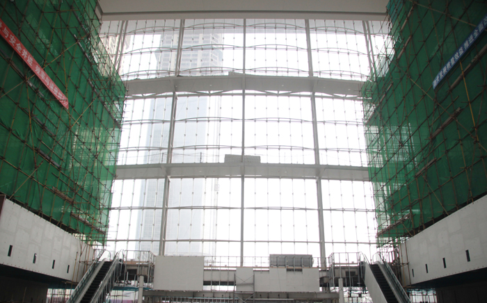 在港源裝飾公司負(fù)責(zé)的施工范圍內(nèi),最高吊頂標(biāo)高可達(dá)52.6米,跨度寬達(dá)108米,滿堂腳手架的超高超大施工環(huán)境,給項(xiàng)目的施工安全、材料運(yùn)輸、施工順序、施工荷載均帶來了很大難題。為實(shí)現(xiàn)預(yù)期的設(shè)計(jì)效果,項(xiàng)目部不斷優(yōu)化施工方案,著重研究施工順序,并在第一時(shí)間邀請(qǐng)專家進(jìn)行反復(fù)論證。即使是在今年國(guó)慶節(jié)期間,項(xiàng)目部的同事仍在工作崗位上分秒必爭(zhēng),針對(duì)相關(guān)施工節(jié)點(diǎn)的結(jié)構(gòu)計(jì)算、材料運(yùn)輸?shù)葐栴}進(jìn)行深入研討,直至得出最優(yōu)解決方案。