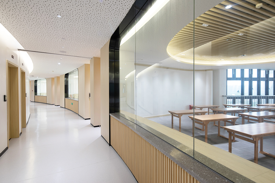 校園環(huán)境關乎著每一位孩子的身心健康,因此,學校建設更應嚴格強調(diào)工程質(zhì)量的安全環(huán)保。對于這一方面,港源裝飾與甲方的意見高度統(tǒng)一,因此仿木紋金屬墻面便成為亮亮中學室內(nèi)環(huán)境的重要材質(zhì)。仿木紋金屬墻面不僅有極佳的質(zhì)感,而且具備環(huán)保、防潮、抗菌等優(yōu)勢,但金屬材質(zhì)易變形的屬性也同時存在。為了堅持環(huán)保優(yōu)先原則,港源裝飾團隊反復論證,決定增加輕鋼龍骨等基層處理工序來保障金屬墻面的平整度及垂直度,并且達到了易于拆裝、降低維護成本的目的。