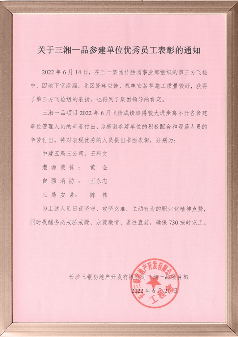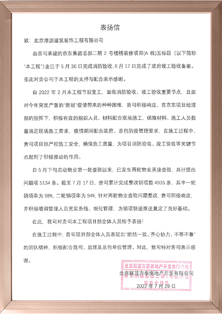 2022上半年,港源裝飾歷經(jīng)重重考驗,一以貫之地發(fā)揚契約精神及頑強奮戰(zhàn)的鐵軍作風(fēng),始終堅持“讓客戶更滿意”的企業(yè)宗旨,奮力完成了各項既定目標(biāo)。一封封表揚信,承載著業(yè)主的支持和贊譽,也是對港源裝飾誠信履約的最好詮釋。