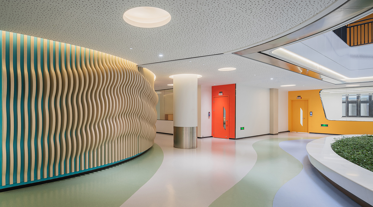 校園環(huán)境關(guān)乎著每一位孩子的身心健康,因此,學(xué)校建設(shè)更應(yīng)嚴(yán)格強(qiáng)調(diào)工程質(zhì)量的安全環(huán)保。對(duì)于這一方面,港源裝飾與甲方的意見(jiàn)高度統(tǒng)一,因此仿木紋金屬墻面便成為亮亮中學(xué)室內(nèi)環(huán)境的重要材質(zhì)。仿木紋金屬墻面不僅有極佳的質(zhì)感,而且具備環(huán)保、防潮、抗菌等優(yōu)勢(shì),但金屬材質(zhì)易變形的屬性也同時(shí)存在。為了堅(jiān)持環(huán)保優(yōu)先原則,港源裝飾團(tuán)隊(duì)反復(fù)論證,決定增加輕鋼龍骨等基層處理工序來(lái)保障金屬墻面的平整度及垂直度,并且達(dá)到了易于拆裝、降低維護(hù)成本的目的。