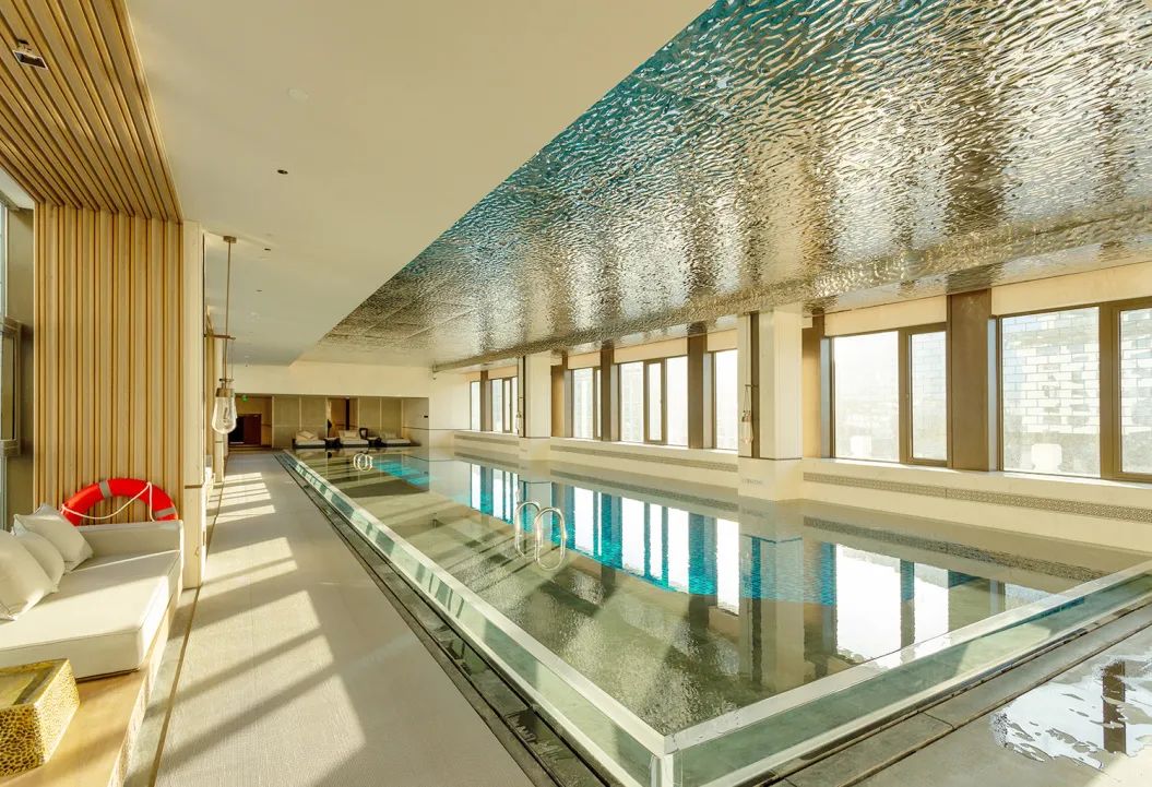 高層泳池位于酒店五樓,在擴(kuò)大使用面積的同時(shí)升級(jí)改造為無(wú)邊泳池,屬于酒店施工的重點(diǎn)控制區(qū)域。港源項(xiàng)目團(tuán)隊(duì)在泳池施工過(guò)程中嚴(yán)格把關(guān),采用透明材質(zhì)作為護(hù)欄,當(dāng)池水恰好漫過(guò)護(hù)欄便呈現(xiàn)出無(wú)邊水面效果,完美實(shí)現(xiàn)了設(shè)計(jì)初衷。
