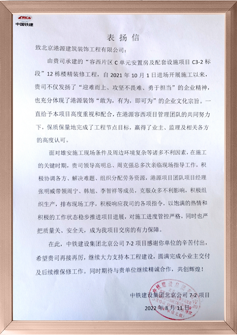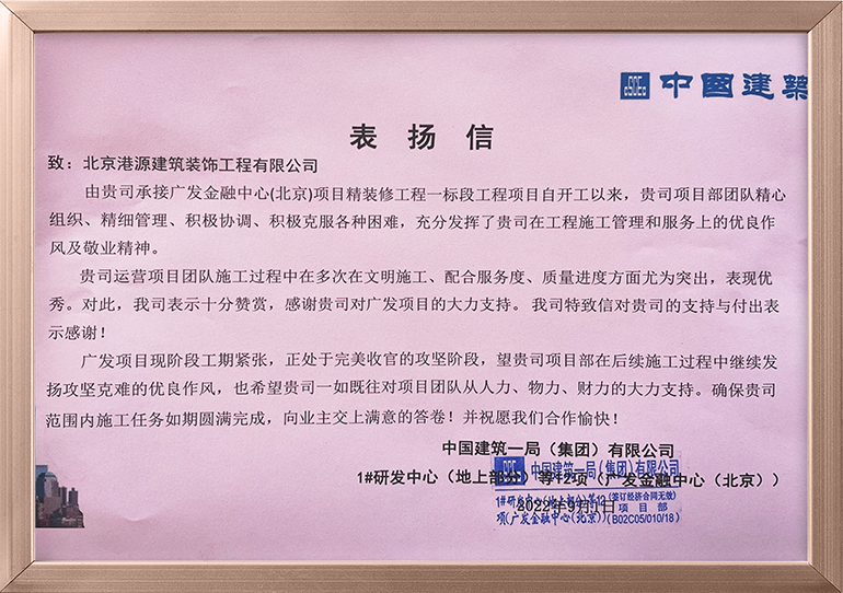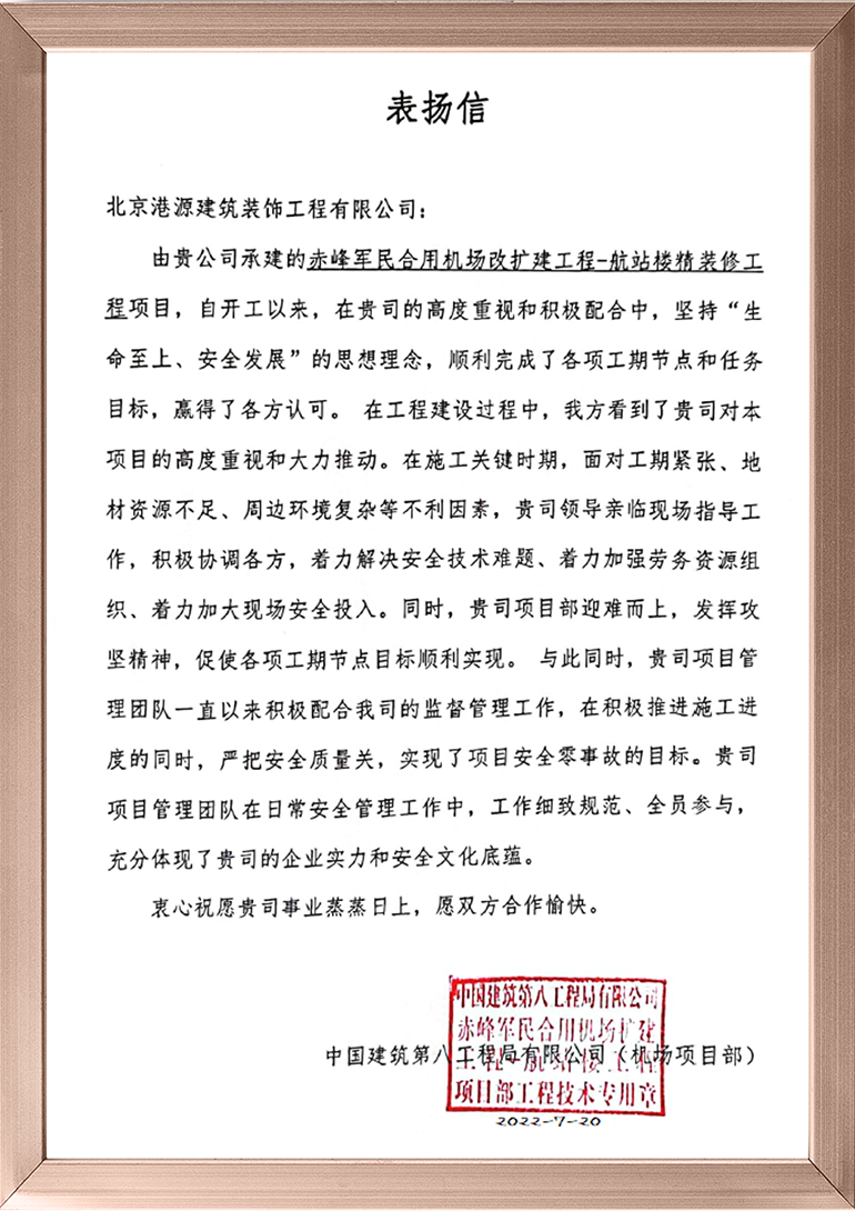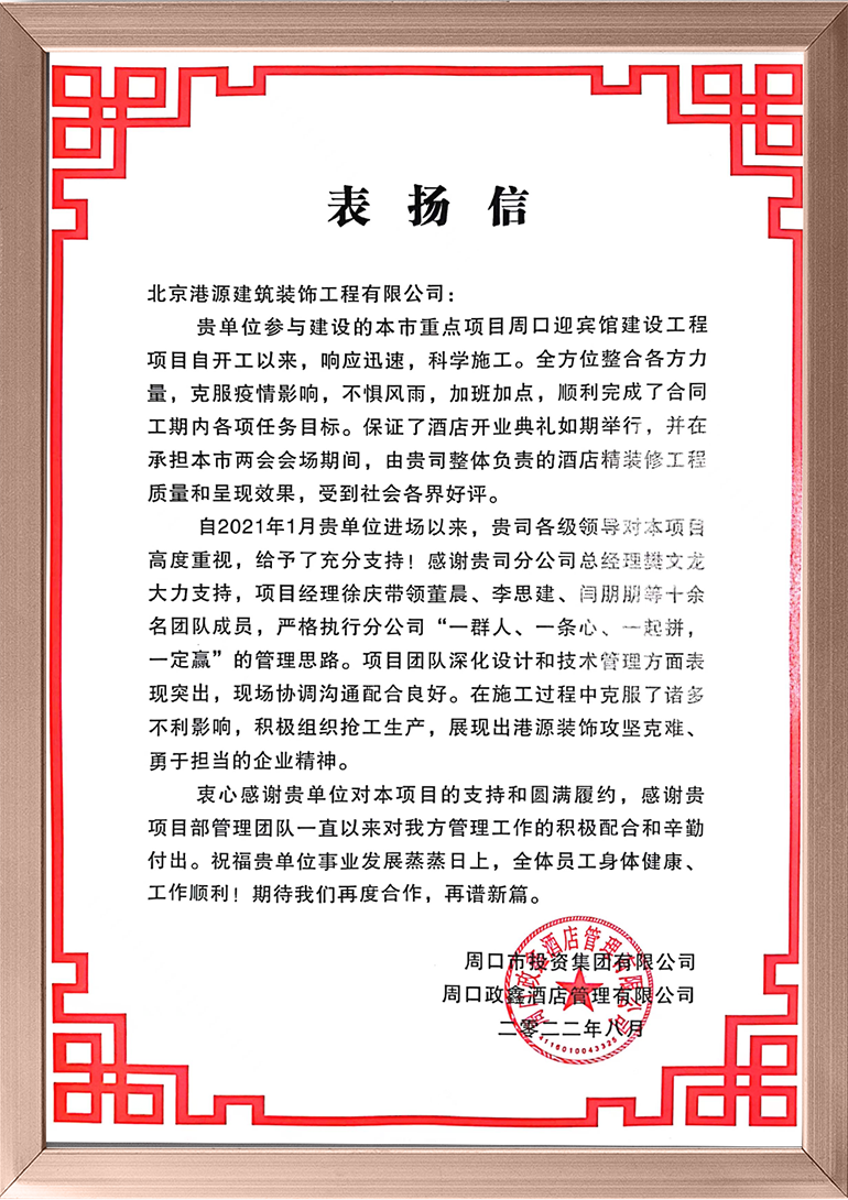 2022上半年,港源裝飾歷經(jīng)重重考驗,一以貫之地發(fā)揚(yáng)契約精神及頑強(qiáng)奮戰(zhàn)的鐵軍作風(fēng),始終堅持“讓客戶更滿意”的企業(yè)宗旨,奮力完成了各項既定目標(biāo)。一封封表揚(yáng)信,承載著業(yè)主的支持和贊譽(yù),也是對港源裝飾誠信履約的最好詮釋。